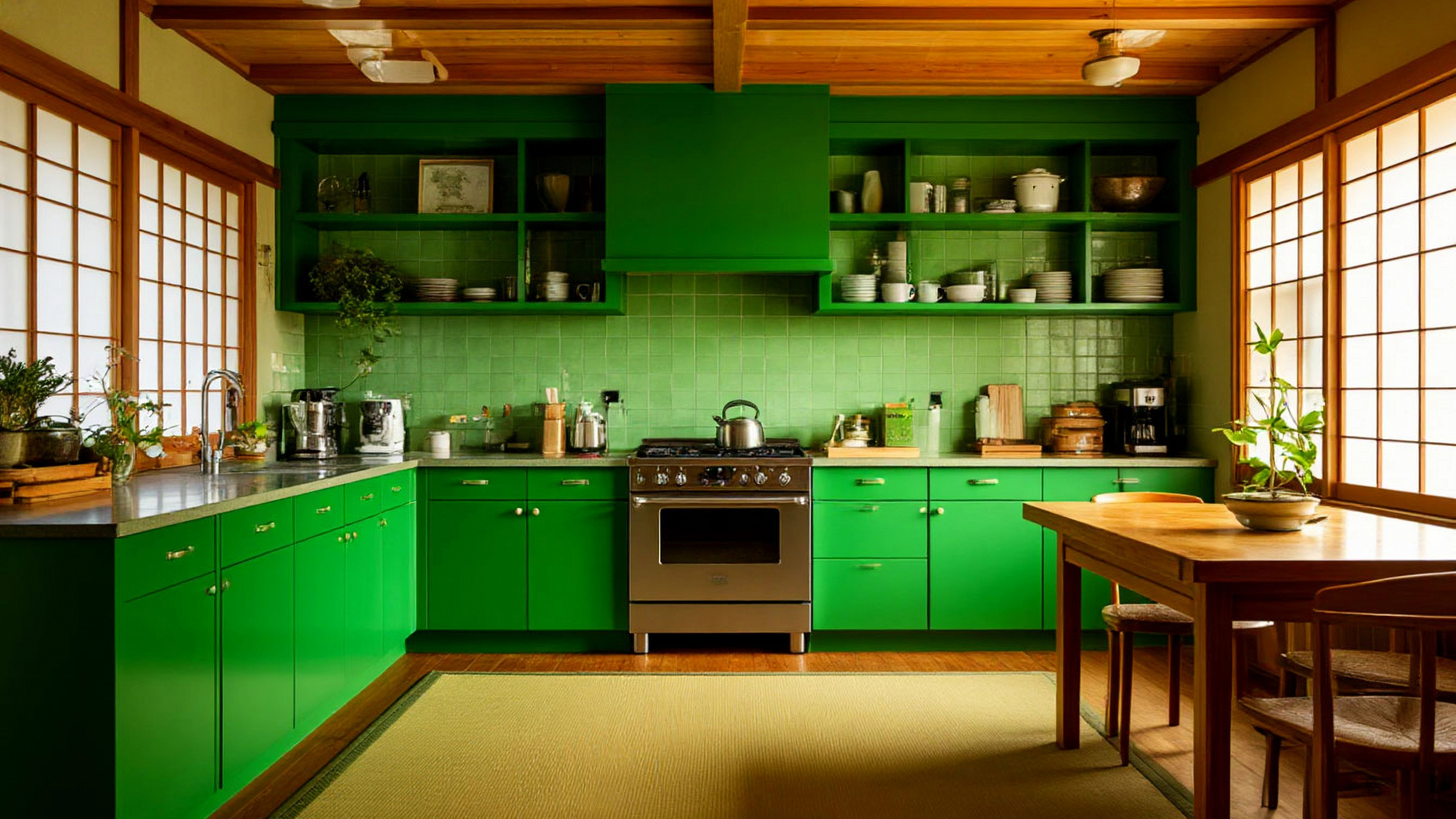 Особое внимание в кухне "Бамбуковая роща" уделено сочетанию современного дизайна и японской философии минимализма. Встроенная техника интегрирована таким образом, чтобы не нарушать гармонию интерьера, а металлические и стеклянные детали подчёркивают современный характер модели. Зеленый цвет фасадов создаёт фон для любых декоративных элементов, будь то посуда, растения или аксессуары, что позволяет легко менять акценты и подстраивать интерьер под настроение.
