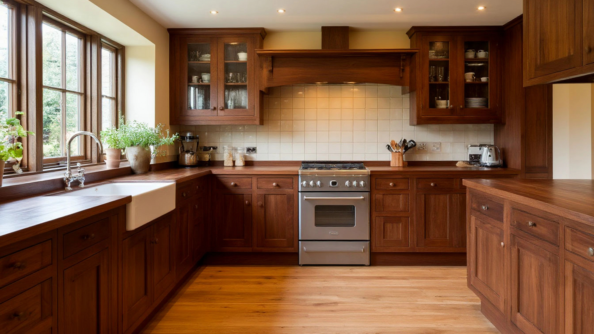 Цвет ореха прекрасно сочетается с другими материалами. Светлая столешница под камень или натуральный мрамор добавляет интерьеру лёгкости и делает его более сбалансированным. Металлическая фурнитура в бронзовых или матовых золотых оттенках подчеркивает теплоту дерева и усиливает атмосферу кантри. Даже мелочи — ручки, петли, элементы декора — работают на создание цельного образа, в котором нет случайных решений.