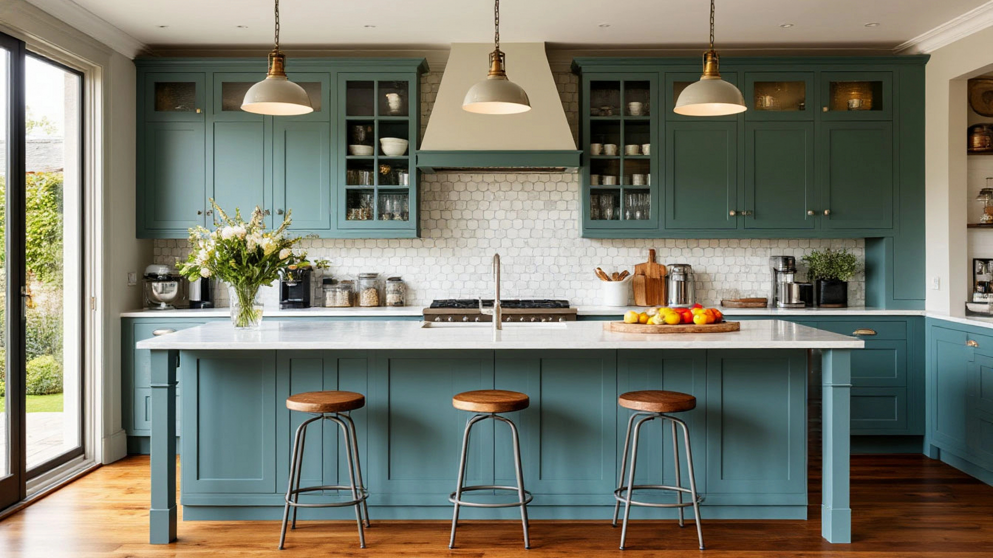Столешницы под мрамор создают ощущение благородства и долговечности. Светлая поверхность гармонирует с серо-голубыми фасадами, визуально расширяя пространство и добавляя легкости. Практичность столешниц не уступает их эстетике: они устойчивы к влаге, высокотемпературным воздействиям и механическим повреждениям, что делает кухню удобной для повседневного использования и создания кулинарных шедевров. Барная зона и рабочие поверхности объединены так, чтобы обеспечить свободное перемещение, удобный доступ к инструментам и продуктам, а также комфортное взаимодействие с гостями.