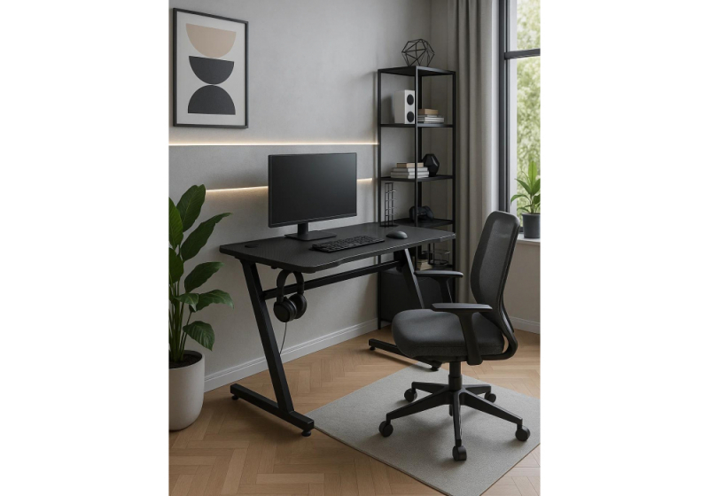 Поверхность столешницы покрыта пленкой под карбон. Стол оснащен подстаканником, крючком для наушников и универсальным держателем. Толщина столешницы: 2 см. Диаметр подстаканника: 9,5 см. Глубина подстаканника: 5,5 см.